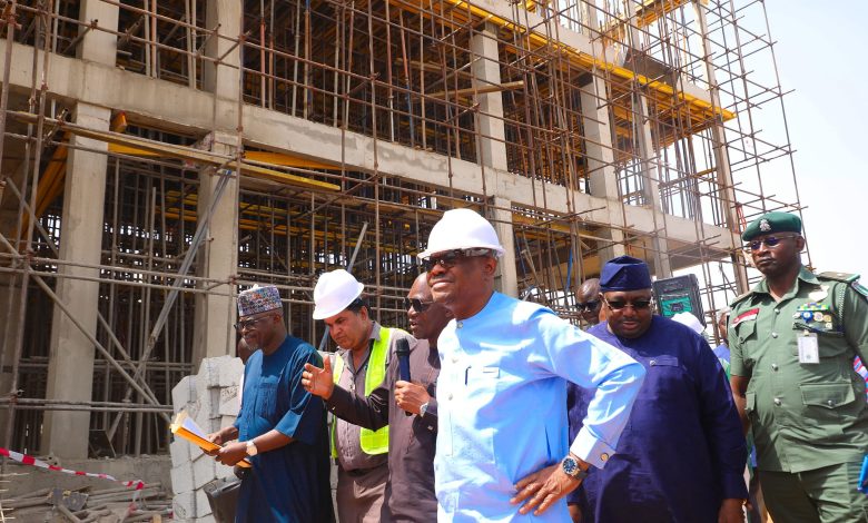FCT Minister Barrister Nyesom Wike (3rd tight) flanked by Ag. ES, FCDA Engr Richard Dauda (3rd left) , Senator Philip Aduda (2nd)) right) and other senior officials of the FCTA during the Minister’s inspection of works on the Abuja Division of the Court of Appeal on Thursday.